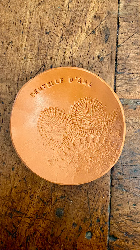 Cette coupelle est façonnée à la main en argile terra cota, dans un geste simple et intuitif. Sa surface garde l’empreinte d’un ancien napperon en dentelle transmis dans ma famille. Mes arrière-grands-parents étaient dentelliers au Le Puy-en-Velay, et ce motif porte aujourd’hui la mémoire de leurs mains patientes.